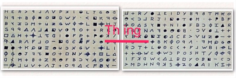 Keyword plaintext is ‘thing’ and the ‘g’ plaintext is to be placed above the cipher ‘X’…6 lines up and 6 lines over in the lower left quadrant