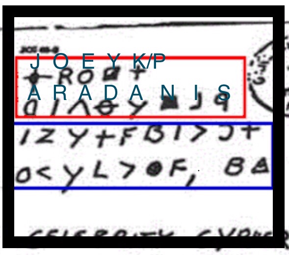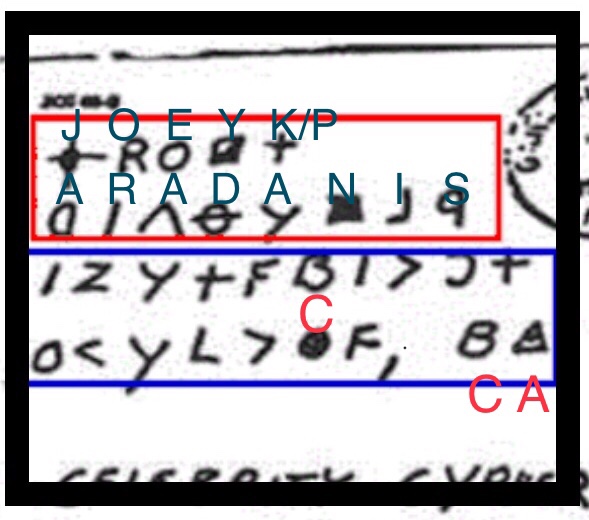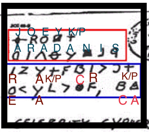 Here we have Karadanis’ name . I throw in the P because I’ll bet sometimes he calls himself Joey Paradise – a mob name for those who couldn’t pronounce Karadanis. The + sign has been given 2 solutions, K and P. It comes in handy later. Of course it only works if you know The Names in advance.