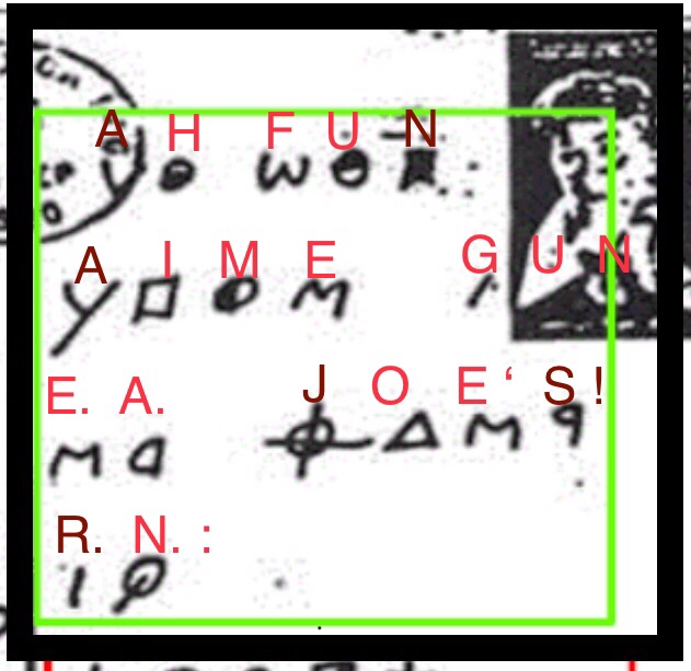from Grinell’s post ‘The Celebrity Cipher [Part 2]’ of 6/18/19 “The Zodiac Killer began his cipher mailings to the Vallejo Times-Herald on July 31st 1969, to which he mailed part one of a three-part cipher to Bay Area newspapers. So this 1990 offering in ciphertext (if Zodiac) would mean the only two confirmed mailings to the Vallejo Times-Herald would both have contained code. The characters of the code are certainly recognizable, but not difficult to replicate for anybody who knows something about the Zodiac Killer. The Bay Area murderer gloried in his narcissism, … so designing a postcard based on the Celebrity Ciphers of Luis Campos would not be beyond him. These ciphers were published regularly in the newspapers featuring well-known people, past and present. The reader had to identify the person and quote from the encoded text. The idea that the Zodiac Killer, deeming himself a celebrity, would then tease us a further time with his name, is not so far-fetched.”