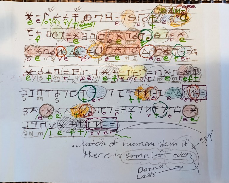 Sent almost a year after Donna Lass went missing nevertheless the partial solution I offer here seems to be mostly about Donna. Again it would seem, as with the 340, Joe Karadanis is indicating his murdering days are through. The key is obvious- ‘sum left over’ is the last line. There is often some left over in a Z cipher. Note in the letter how it trails off just as Donna Lass entered her final log entry, supposedly. (see Zodiac Ciphers site for full cipher with text)