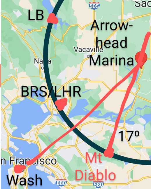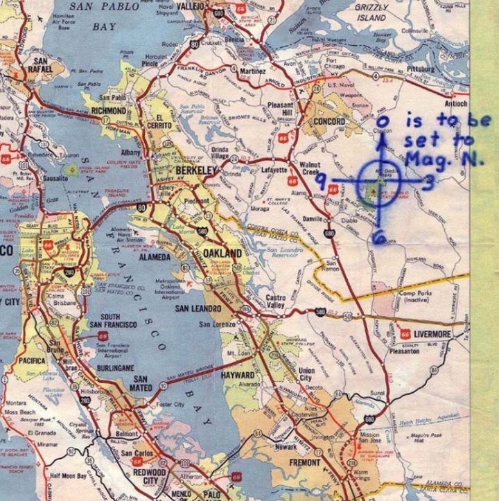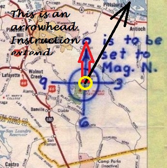 What’s left is a clock face without a clear meaning, an arrowhead instructing us to extend a line North, and an instruction to turn that extended line 17 degrees East (Mag N at the time)