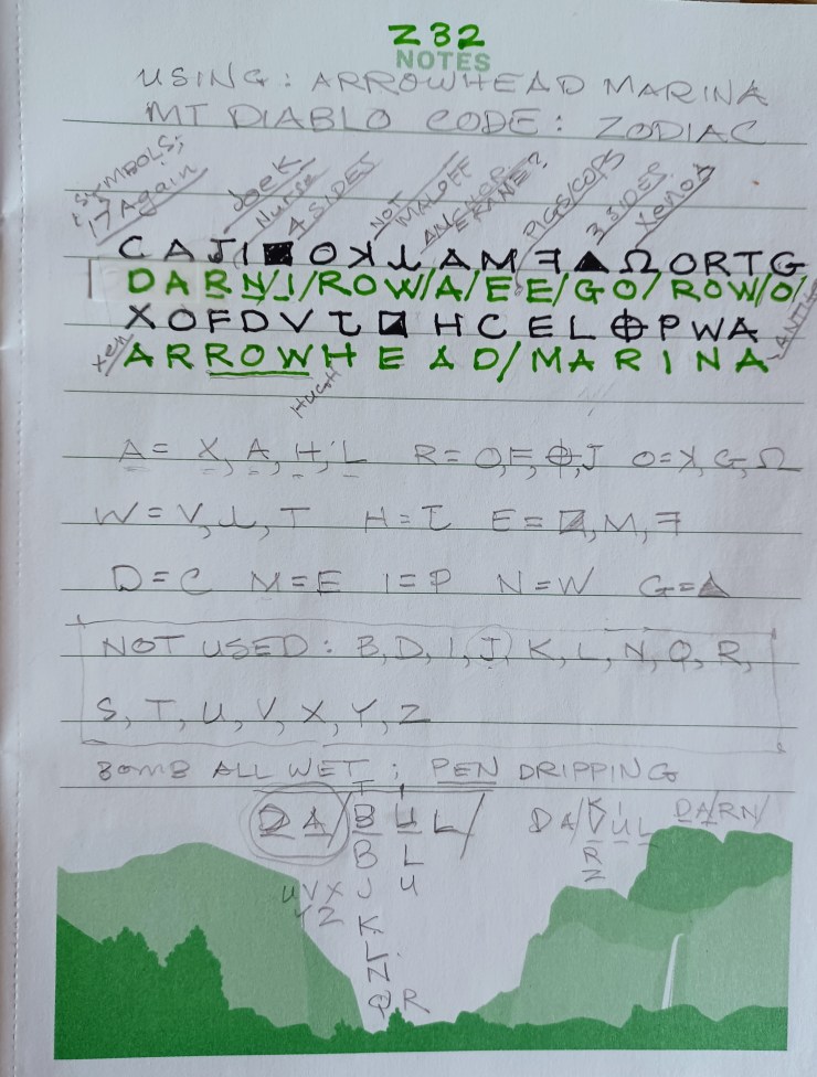 Plugging Arrowhead Marina into the second line of the cipher, where it fits perfectly, the rest, when using straight substitution deciphering, hearkens back to my Z340 solution (row, row etc).